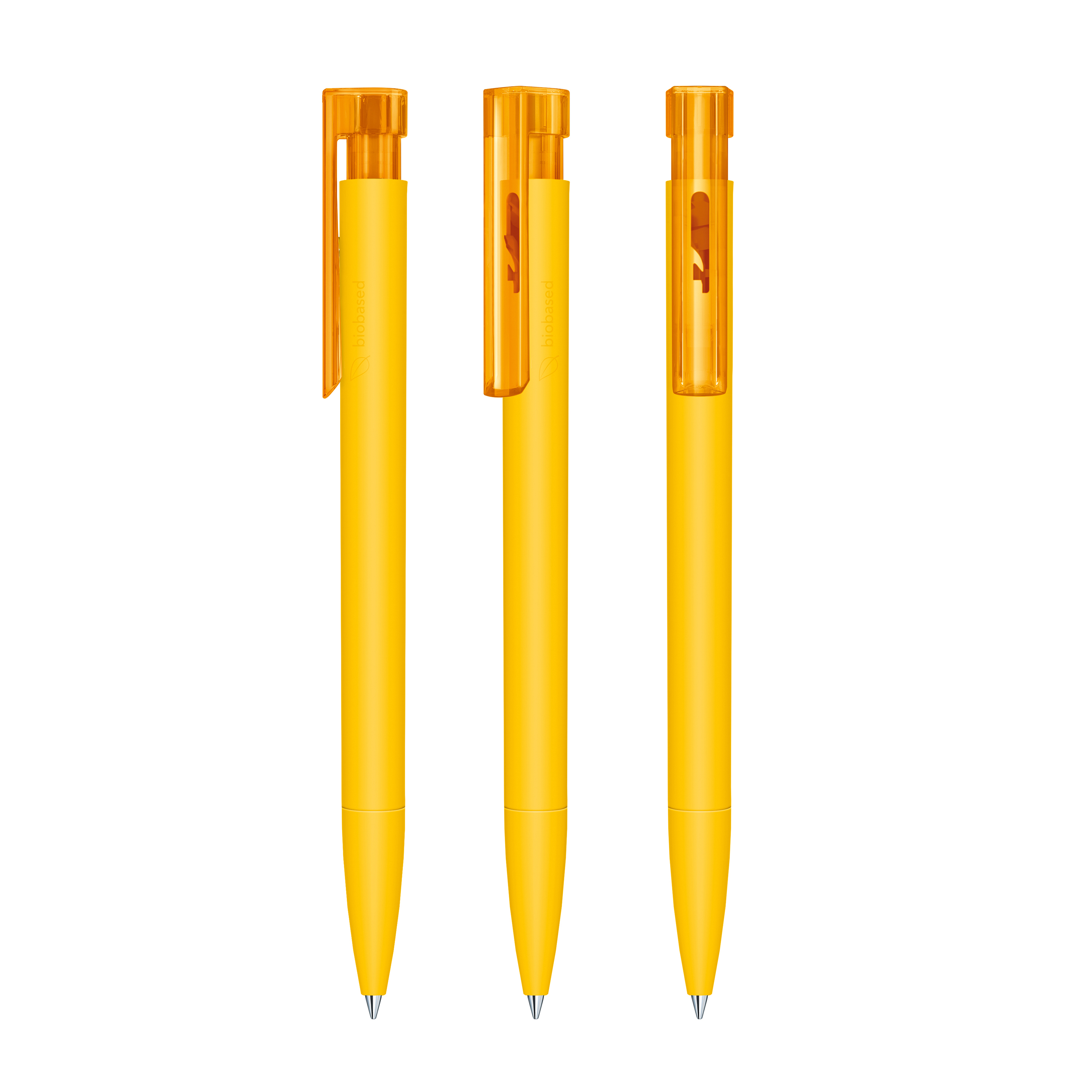 Druckkugelschreiber „senator® Liberty Bio“ – klar, modern und biobasiert. Der „Liberty Bio“ verfügt über eine matte Oberfläche und wird aus biobasiertem Kunststoff (PLA auf Zuckerrohrbasis) gefertigt. Seitlich ist er mit der Kennzeichnung „biobased“ versehen, die seinen nachhaltigen Anspruch sichtbar macht. Ein transparenter Clip ergänzt das klare, moderne Design und setzt einen leichten Akzent. Mit der senator® magic flow G2 Mine (1,0 mm) erreicht er eine Schreiblänge von bis zu 5.000 Metern – zuverlässig und präzise. Der Kugelschreiber ist Made in Germany und steht für höchste Qualität, Langlebigkeit und Zuverlässigkeit. Die Option einer kostenlosen Ersatzmine verlängert die Lebensdauer und sorgt für mehr Nachhaltigkeit und anhaltende Werbewirkung.