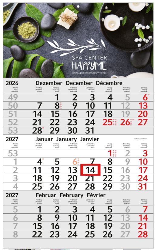 Der Budget 3 Bestseller ist der ideale Kalender für kostenbewusste Unternehmen, die auf Übersicht und Werbewirkung setzen. Mit einem modernen 3-Monatskalendarium, klarer Typografie und einem individuell bedruckbaren Kopfteil kombiniert er Funktionalität mit attraktivem Design. Ein zuverlässiges Werbemittel, „Made in Germany“.