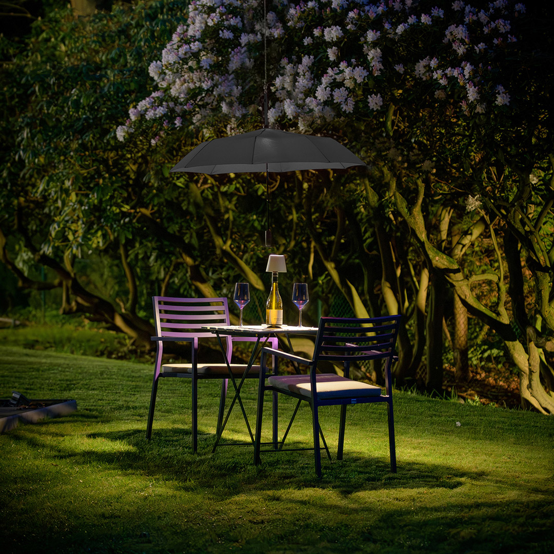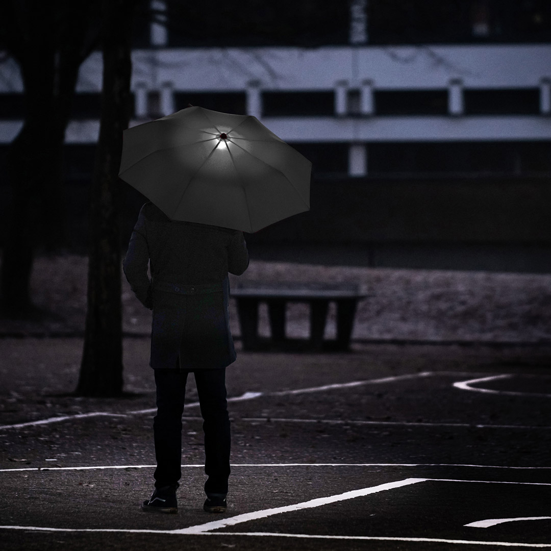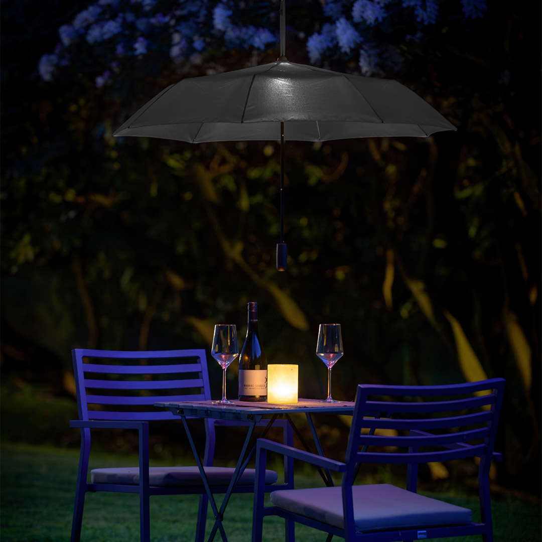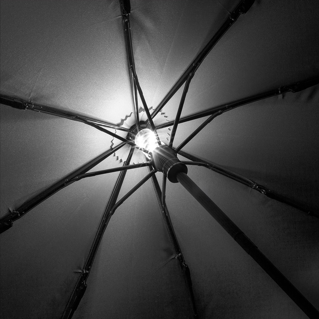 Effektvoller Taschenschirm mit LED-Innenbeleuchtung und Aufhängefunktion